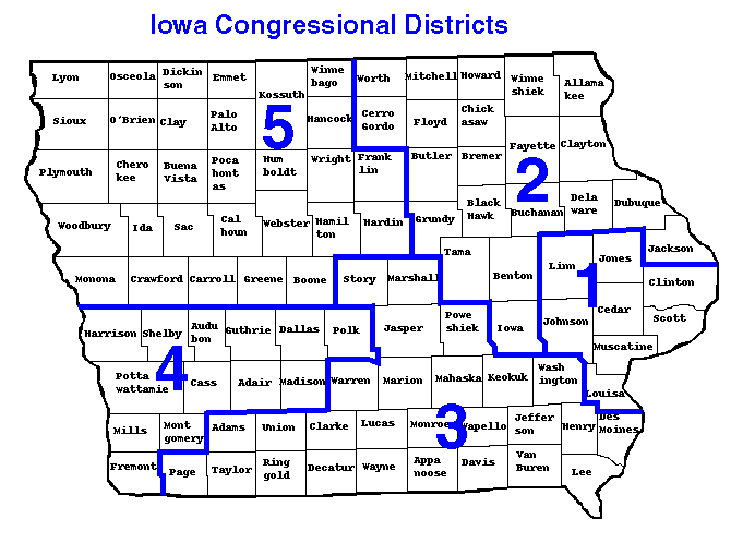 Below is an interactive map of the Iowa districts for the U.S. House of Representatives for the 107th Congress. Simply point and click on the district of interest to you.