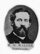 Seventh Lieutenant-Governor of Iowa, was born in Ohio, in 1836. He received a good education and came to Iowa in 1853, locating at Centerville in Appanoose County. He was a printer and for a long time the able editor of the Centerville Citizen, a Republican weekly of wide influence. When the War of the Rebellion began Mr. Walden raised a company for the Sixth Infantry Regiment and was commissioned captain. In December, 1862, he resigned and in 1863 recruited a company for the Eighth Cavalry. He was taken prisoner in an engagement at Newnan, Georgia, in July, 1864. Mr. Walden was an excellent officer and remained in the service until near the close of the war when he returned to his home at Centerville. In 1866 he was a member of the House of the Eleventh General Assembly and at the close of his term was elected to the Senate for four years. But after serving one session he was nominated by the Republican State Convention for Lieutenant-Governor and elected. Before the expiration of his term he was nominated for Representative in Congress by the Republicans of the Fourth District and elected. In 1890 he was again a member of the Legislature from Appanoose County. Soon after the close of the session he received an appointment in the Treasury Department at Washington and removed to that city where he died on the 24th of July, 1892. Governor Walden was an able editor, a graceful writer, an influential legislator and an accomplished presiding officer.