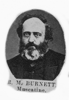Born in Onondaga County, New York, July 11, 1821. He resided in his native State until in 1852, when he came to Iowa, locating in Muscatine and engaging in the book and stationary business. From his arrival he was interested in the welfare of his country and home city, and was always ready to talk in defense thereof. He was thoroughly posted on all matters of public interest and had a rare gift of eloquence. Not only in matters of public interest did he take a prominent part, but in the church and Sabbath school he was active. He was one of the most earnest and faithful members of the First Baptist Church, being deacon of the church and superintendent of the Sabbath school for nearly thirty years. Mr. Burnett was twice elected to the Legislature, in 1866 and 1868, faithfully serving his constituency at both sessions. He for four years held the appointment of Regent of the University and was a valued official of that institution. He was one of the organizers of the Merchants Exchange National Bank, now the First National Bank of Muscatine, and was one of its directors from its organization. Mr. Burnett was married in 1849 to Miss Frances Edwards, in Onondaga County, N. Y.