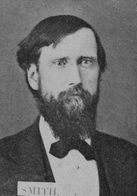 Born on May 14, 1828. When about sixteen years of age his father died, leaving the family in somewhat straightened circumstances having failed in business some time previous to his death. It will be seen that his means of receiving an education during the early portion of his life was rather limited, but having a thirst for knowledge, at the age of twenty-one, succeeded in being admitted as a student in Mt. Pleasant College, Jefferson County, Ohio. In December, 1849, he married Miss Lydia Clendennon, in Barnesville, Belmont County, Ohio. Following the Star of Empire westward, he immigrated to Iowa in April, 1853, and settled upon a farm in Warren County. Here he met with a great misfortune, having been completely burned out in the winter of 1854-51 but being possessed with that true courage so requisite to contend against the ups and downs of western life, he immediately set to work and replaced the home he had lost by the fire. In the spring of 1857, he changed his location by moving to Taylor County, where he opened a new farm, on which he had erected a very fine house. Just as he had his farm all fenced and everything fixed up to make life comfortable, again he was pursued and over taken by the fiery demon and once more all his worldly goods perished in the flames. By perseverance, good management, and industry he again succeeded in overcoming this great misfortune, and during the war, although not in the army, had so far recovered from his loss as to donate largely, in money and goods. Senator Smith has always been a thorough and steadfast republican in politics, and strong in the principles of anti-slavery. In 1858 he was elected clerk of the District Court of Taylor County, which position he held for twelve consecutive years. In 1870 he established the Taylor County Bank, of which he was president. Officially, he was not extensively in public life. In 1868 he was a delegate to the Philadelphia Convention where he supported the nomination of Grant and Colfax. As a further mark of the great confidence the people repose in him, he was elected by a popular vote of the citizens of the Seventh Senatorial District, comprising the counties of Taylor, Ringgold and Decatur to represent them, and look after their interests in the 14th General Assembly of the State of Iowa, for the period of four years commencing on the 1st of January, 1872. Mr. Smith is a Quaker by religion.