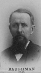 One of the best known men in the county, at one time member of the state legislature, and a resident of the county since 1855. Mr. Baughman was born in Westmoreland county, Penn. on June 19, 1828 of "Pennsylvania Dutch" being the son of Jacob and Margaret (Cort) Baughman. In 1850, Mr. Baughman married Julia B. Schwartz, a native of Germany who came to the United States in childhood. In the spring of 1855, Mr. Baughman made his first trip to Iowa alone, then went back to Pennsylvania for his wife and children and came west again in the fall of that year. When he came he came across the old Mormon trail to Iranistan and came in a prairie schooner drawn by four horses He cut logs that winter and built a cabin on his claim and the cabin he then built was the first house in Pleasant township. In 1881, he was elected representative from this county in the state legislature and served two years therein.