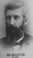 Born in Newark, Delaware, June 21, 1842, son of James McManus a member of the 1st Iowa General Assembly. The nomination and election came to him unsought. He was educated in Iowa College, and spent two years at Amherst College, Massachusetts. He enlisted in the army in October, 1861. At the age of 19 he was elected first lieutenant of Twenty-seventh Massachusetts Regiment, and at the Battle of Roanoke Island he commanded the company. He was adjutant of the regiment when captured on May 16, 1864, at the battle of Fort Darling, or Drury's Bluff. He was at once incarcerated in Libby prison; was subsequently moved from one prison to another, as was deemed necessary by the rebels, and on November 29 he escaped from Columbia, S. C, and in company with two comrades traveled 200 miles, consuming 17 days, reaching our gunboat at Winyaw Bay on December 15. He had been commissioned captain, June 4, 1864. Having served five months more than his term of enlistment, he was mustered out of service February 11, 1865, and returned to Davenport. After taking a course in Pittsburg Commercial College, he spent a season farming. In l867 he went out on the plains and operated with his uncle, William McManus, who was a contractor on the Union Pacific R.R. In 1879 he returned to this city, and has since been engaged in agricultural pursuits. He has always been a pronounced Republican, but based his action upon principle, and is not a radical partisan. In the fall of 1881 he was elected to the Iowa General Assembly, without opposition on the part of the Democracy. Mr. McManus married Flora N. Meek in Davenport, March 9, 1876. He was involved life insurance, real estate, owner and manager of office building. In addition to being a member 19th General Assembly of State of Iowa, he was treasurer Scott County, 3 terms, and auditor 1 term. He died November 28, 1922 in San Diego, California.