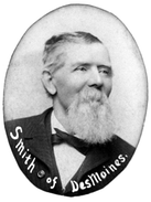 Born at Skipton, in Yorkshire, England, March 8, 1825, the third of a family of ten children, son of Peter and Martha (Ellison) Smith, and accompanied his parents to America in 1835. Mr. Smith obtained his formal education almost wholly in his native country, the only schooling which he received subsequent to his tenth year being that of a six. weeks' term in the public schools of Burlington township, Des Moines county. Despite the meagerness of his early advantages, however, he formed a taste for reading, which he always retained, and through habits of reflection and intelligent observation he became possessed of the extensive knowledge and broad views which made him a man of true and universal culture. With the exception of a short period, during which he learned and worked at the brick-maker's trade, he remained with his parents until his twenty-sixth year. On April 9, 1851, he was united in marriage ·with Miss Mary A. Hunt, daughter of Jesse and Delinda (Kirkpatrick) Hunt. Immediately after his marriage to Miss Hunt, Mr. Smith removed to Danville township, purchasing there a farm on which they resided for eleven years. In 1865 they again removed, establishing their home in the village of Danville, and also purchased a farm of one hundred acres within the present corporate boundaries of the village. He also built the elevator at Danville, and entered the grain business on an extensive scale, continuing to conduct the enterprise with signal success until his death. By the purity and strength of his character he commanded the unqualified confidence of the people, and as a leading member of the Democratic party, with which he was closely identified during the major portion of his active life, he exercised a widespread and intimate influence upon the public affairs of his time. In 1889 Des Moines county chose him as its representative in the State Legislature of Iowa, and in this capacity he served his fellow-citizens for two years, with great credit to himself and lasting benefits to his constituency. He was always active in the conduct of township affairs, and was for many years a township school director, for he was an earnest advocate of the State public school system, believing that therein lay the foundation for the perpetuity of the State and popular government.