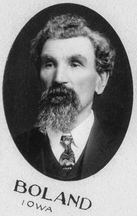 EDWARD BOLAND was born near Belfast, Ireland, July 14, 1841, and died at Webster, Iowa, February 16, 1928. Burial was at Williamsburg. His parents were Edward Boland, Sr., and Ellen (Cargo) Boland. The parents removed with their family to Ontario, Canada, in 1856. The next several years the son spent partly in Canada and·partly near Monmouth, Illinois. In 1868 he removed to Iowa County, Iowa, where he engaged in farming, in which business he was successful. He became a naturalized citizen in 1874, held several township offices, among them being assessor, trustee, and justice of the peace, and in 1903 he was elected representative and served in the Thirtieth and Thirty-first general assemblies.