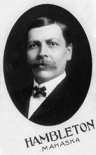ALBERT F. N. HAMBLETON was born at Forest Home, Mahaska County, Iowa, September 4, 1857, and died at South Pasadena, California, September 11, 1922. His parents were Levi and Mary Hall Hambleton. He attended common school, the preparatory department of Iowa College, Grinnell, for one year, Oskaloosa High School two years, and in 1873 entered Penn College. In 1874 he left school to enter his father’s store at Oskaloosa as a clerk. For a few years he was in the general mercantile business in Springville, Linn County, but returned to Oskaloosa in 1885 and engaged in the real estate and abstract business. In 1900-1902 he was a member of the Mahaska County Board of Supervisors. He was elected representative in 1903 and was re-elected in 1906, serving in the Thirtieth, Thirty-first, and Thirty-second assemblies, and was speaker pro tem of the Thirty-second. He was a member of Friends’ church, was a trustee of Iowa Yearly Meeting for years, and was a trustee of Penn College for twenty years, being secretary of the board for a time, and later, chairman. He was president of the Iowa State Sunday School Association in 1904-06. He removed to California in 1910 and engaged in real estate and insurance business. He there was a trustee of Whittier College, Whittier, California.