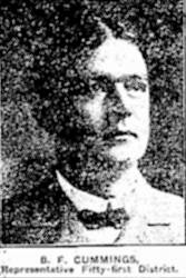 BENJAMIN FRANKLIN CUMMINGS was born in Windsor, Broome County, New York, April 5, 1864, and died in Marshalltown, Iowa, August 25, 1930. His parents were Dr. William C. and Mary Hannah Lounsbery Cummings. The family removed to Eddyville, Iowa, when the future judge was but three weeks old, and after a short residence there and later at Oskaloosa, settled in Marshalltown in 1865. B. F. was graduated from the Marshalltown High School in 1880 and from the Law Department of the University of Michigan in 1885. Beginning practice at Marshalltown he was elected city attorney in 1887 and served four years. In 1894 he was elected county attorney of Marshall County and was re-elected and served four years. In 1901 he was elected representative, and was re-elected two years later, serving in the Twenty-ninth, Thirtieth and Thirty-first general assemblies, being speaker pro tem in the latter two. In 1913 Governor Clarke appointed him judge of the Seventeenth Judicial District and by reason of elections he served until he resigned in February, 1930, to resume private practice. He was a member of the local school board several years and attained the rank of lieutenant in the Iowa National Guard. He was an able lawyer and a successful business man.