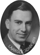 Carroll Johnson was born September 18, 1913, son of J.H. and Pearl Eastburn Johnson. He attended the University of Chicago and was admitted to the Iowa bar in 1936. He married Edna Stone of Bussey, Iowa in 1940. After serving three terms in the Iowa legislature, he joined the FBI during World War II. He returned to Knoxville to practice law with his father, and dedicated over 50 years to his profession. He was a member of the Iowa Bar Association and served four years on the board of Governors.